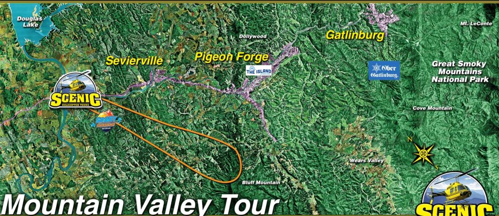 A very popular tour with groups wanting to see more of the area’s natural beauty. It offers views of Sevierville, Pigeon Forge, and Bluff Mountain. As you take off on your flight out to Bluff Mountain and begin soaring over the Tennessee Valley, you are greeted with stunning views of the Great Smoky Mountains National Park in the distance. The highlight of this trip is getting up close and personal with Bluff Mountain and Sugarloaf Mountain.